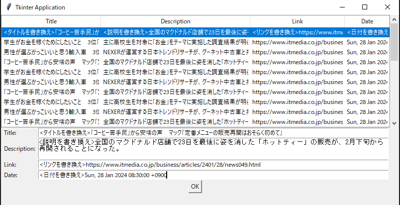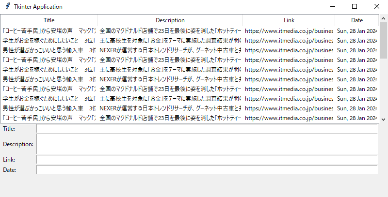 タイトル、リンク、日付は1行の表示で良いので、エントリ(tk.Entryクラス)を利用している。また、説明は複数行(3行)表示させたいので、テキストボックス(tk.Textクラス)を利用している。