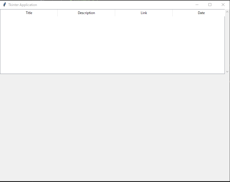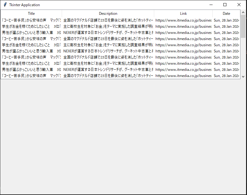 self.master.grid_columnconfigure(0, weight=1)今回はタイトル、詳細、リンク、日付の列を持つ表とするため、columnsは上記のように設定する。